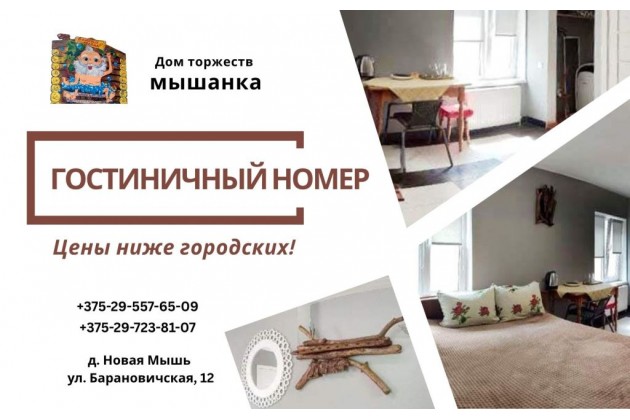Всего в нескольких километрах от Барановичей спрятан небольшой загородный комплекс МЫШАНКА. Здесь есть все для праздников и веселых выходных: банкетный зал, беседки с  мангалами, банный дворик и даже свой гостиничный номер со всем необходимым для полноценного отдыха. При этом цены на ночлег и проживание в МЫШАНКЕ существенно ниже городских: отличный вариант для семейных выходных, романтических уик-эндов, дружеских посиделок на природе или удаленной работы.